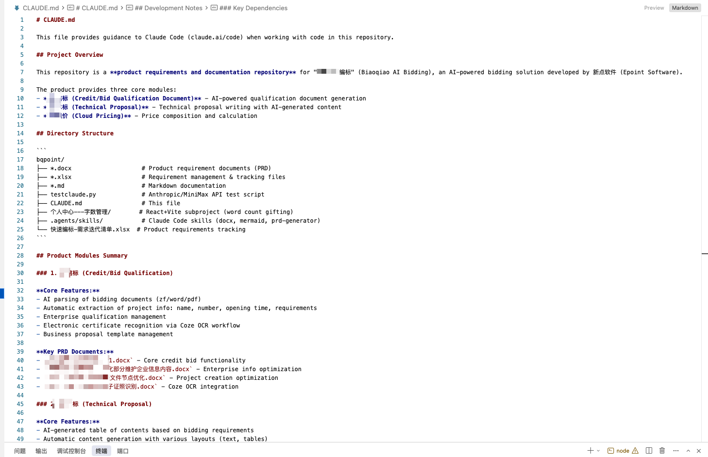 4、输入/init初始化项目。ai将自动浏览项目文件夹下的所有文件,并进行总结。需要注意的是,因为我们提供了许多之前的需求文档.docx给ai,ai本身不具备读取word的能力,请必须安装能够读取word的skills,如docs(见部署claude那篇文章)