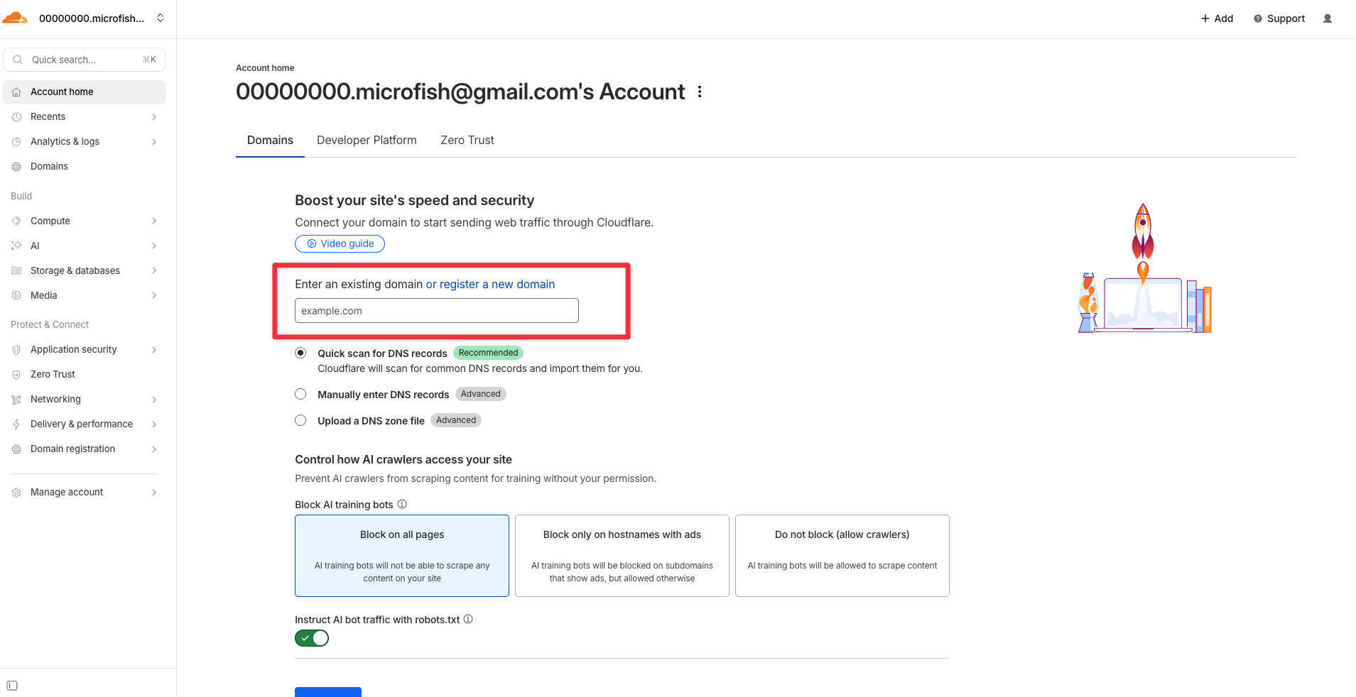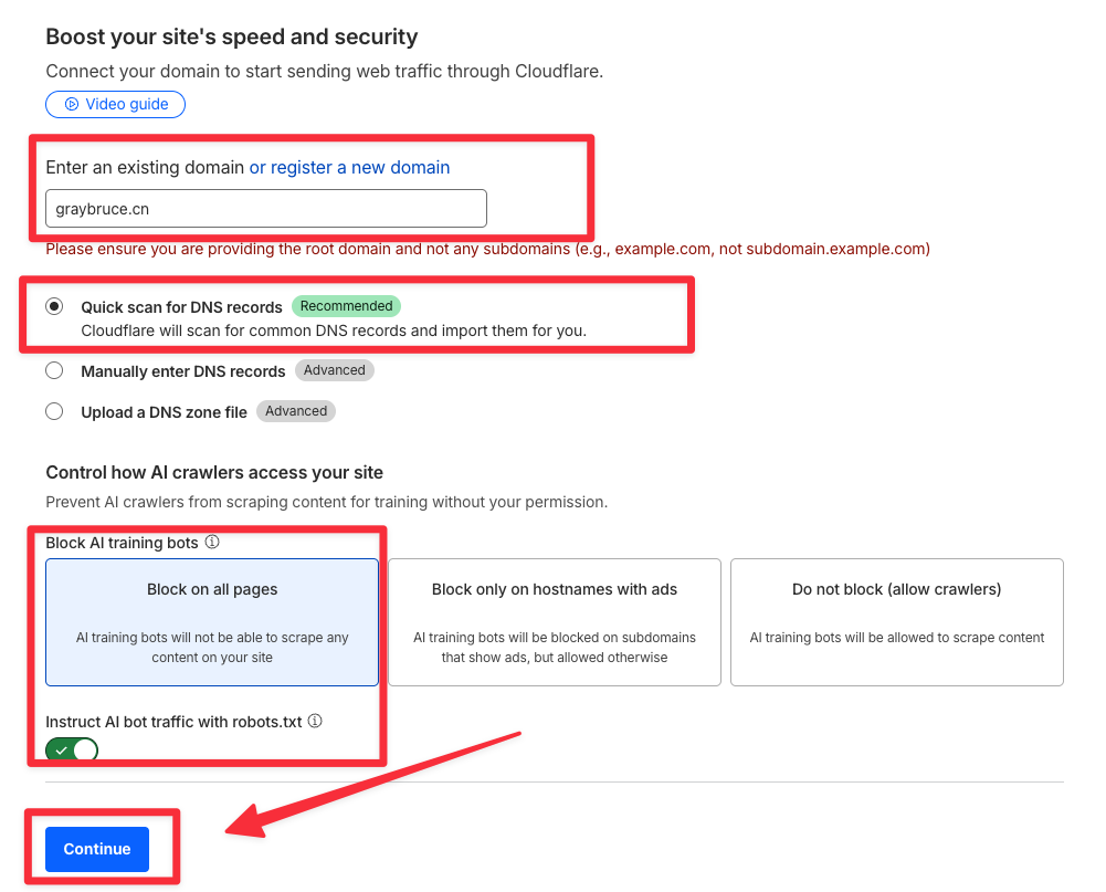 2、进入首页后,输入你刚刚注册的域名,并根据需要选择dns添加方式和是否进行ai反爬。填写完成后,点击continue