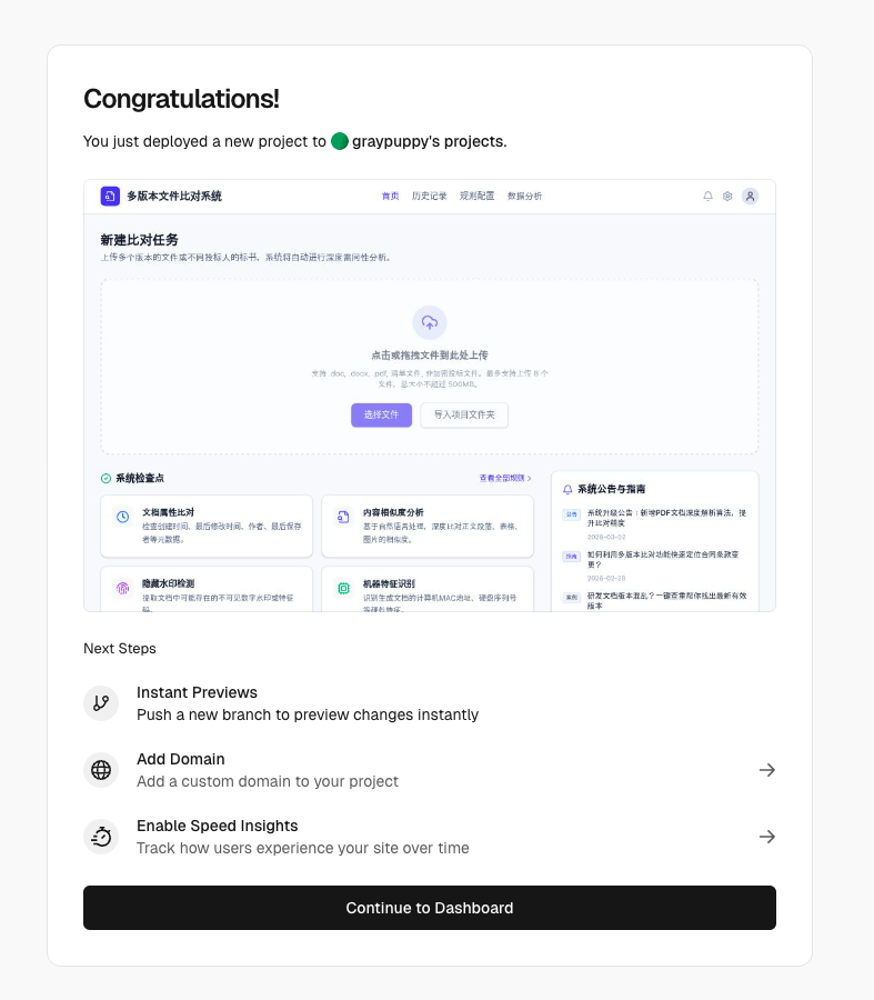 5、部署完成后,会直接生成一个vercal域名的url,因服务器在海外,访问时需要翻墙。