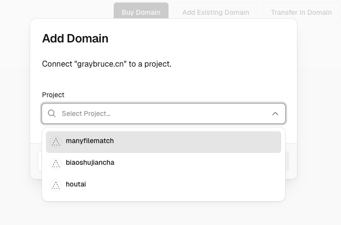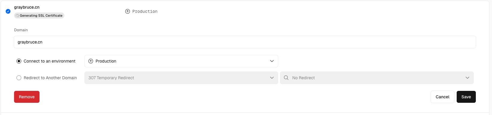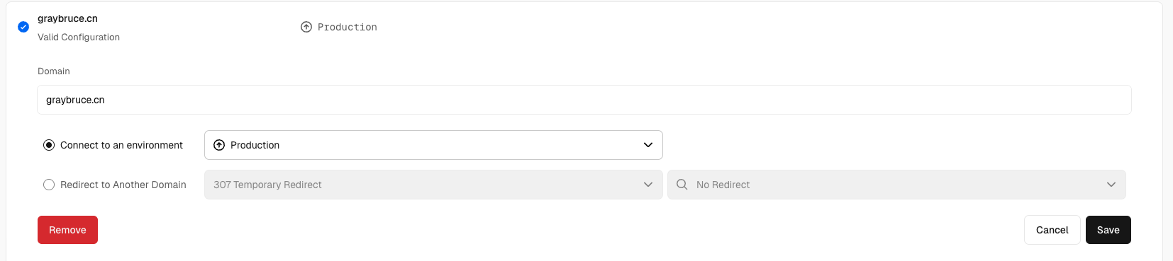 3、选择后,会提示进入域名编辑页面,需要在这个页面添加解析。解析值来源于第二章中vercel给的内容。