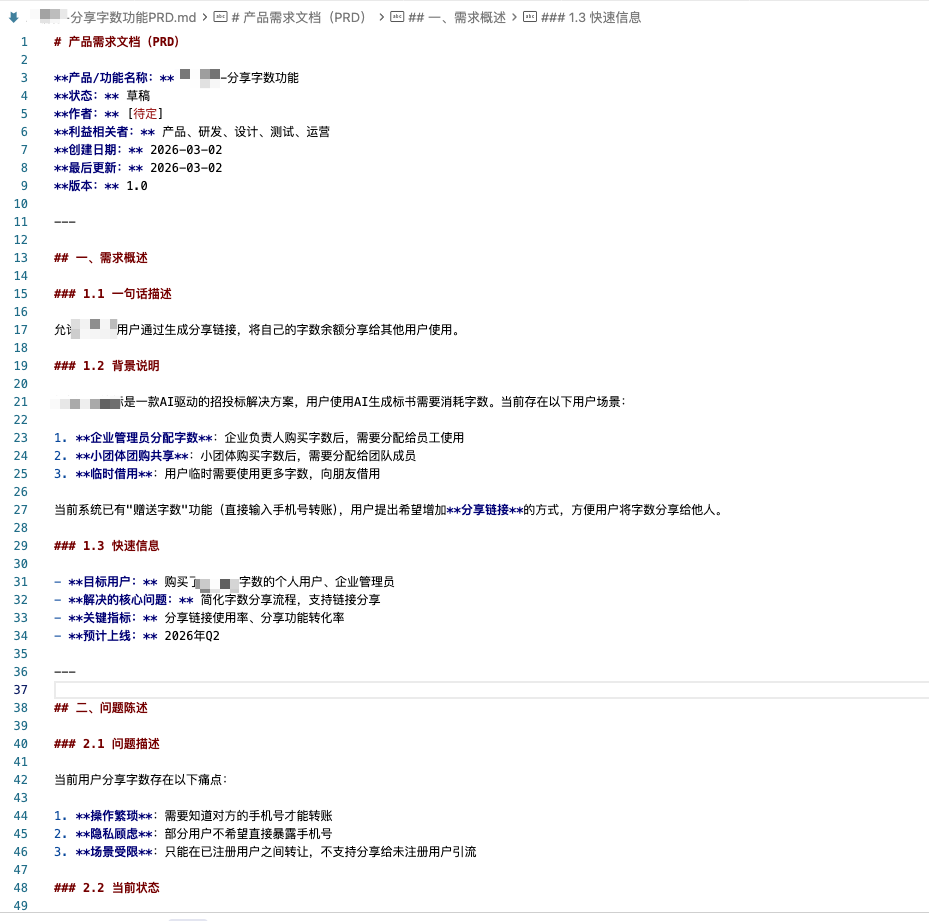 给ai编标产品中增加一个赠送字数的功能,赠送字数时生成链接发给被赠送人,被赠送人通过链接领取字数。ai会根据需求结合我之前所提供的需求,如“个人中心新增“赠送字数”功能.docx”和“claude.md”生成需求文档.md