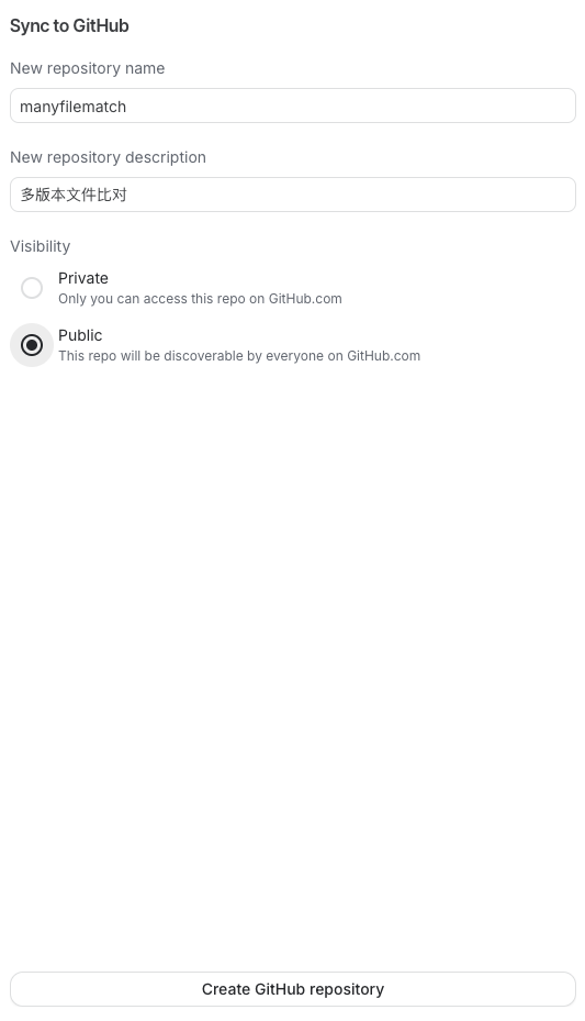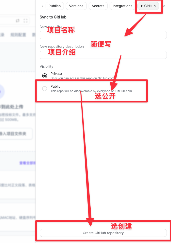 2、在完成github授权后,填写项目名称、项目介绍、选择“public”,完成创建。