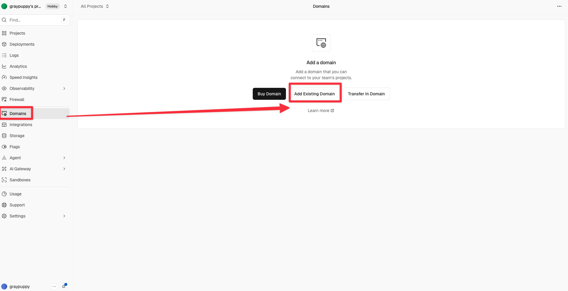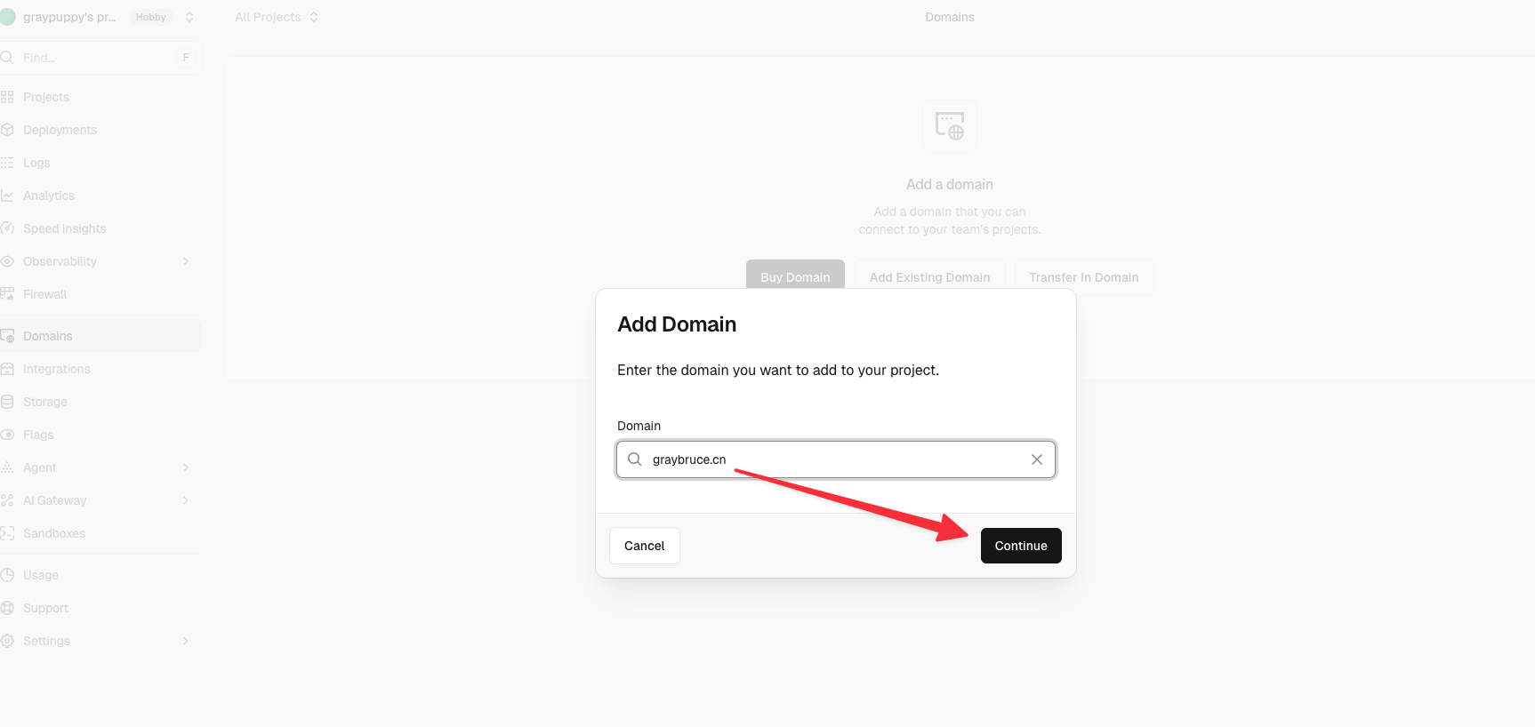 3、选择后,会提示进入域名编辑页面,需要在这个页面添加解析。解析值来源于第二章中vercel给的内容。
